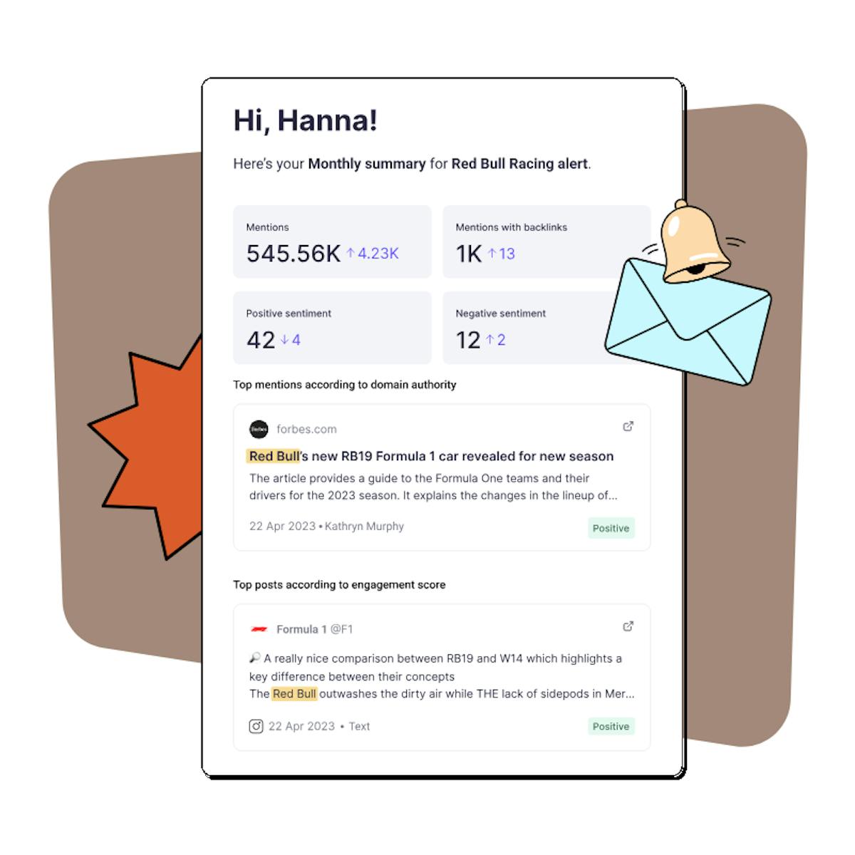 Schedule custom mention digests and alerts so your team and clients receive recurring and real-time media updates.