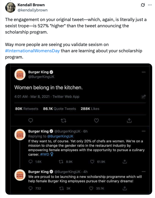 On March 8 2021, Burger King's UK branch came out with a campaign intended to promote a new scholarship program for women, aimed at increasing the number of female chefs in the culinary industry. Sounds great, right? Yeah, well... their slogan said "Women belong in the kitchen".