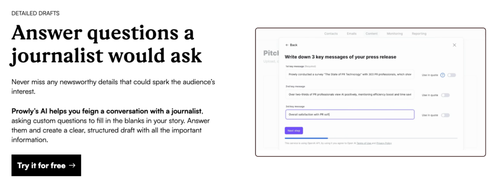 - Detailed drafts: Prowly’s AI prompts you with questions a journalist might ask—helping you fill in the blanks and shape a clear, newsworthy draft.