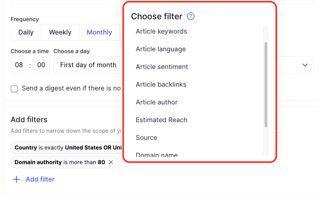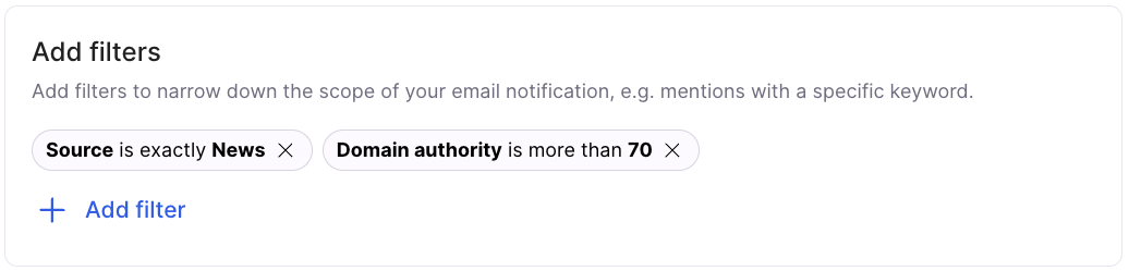 At the bottom of the notification builder, the last step is to add your chosen filters to narrow down the mentions your digest will be analyzing.