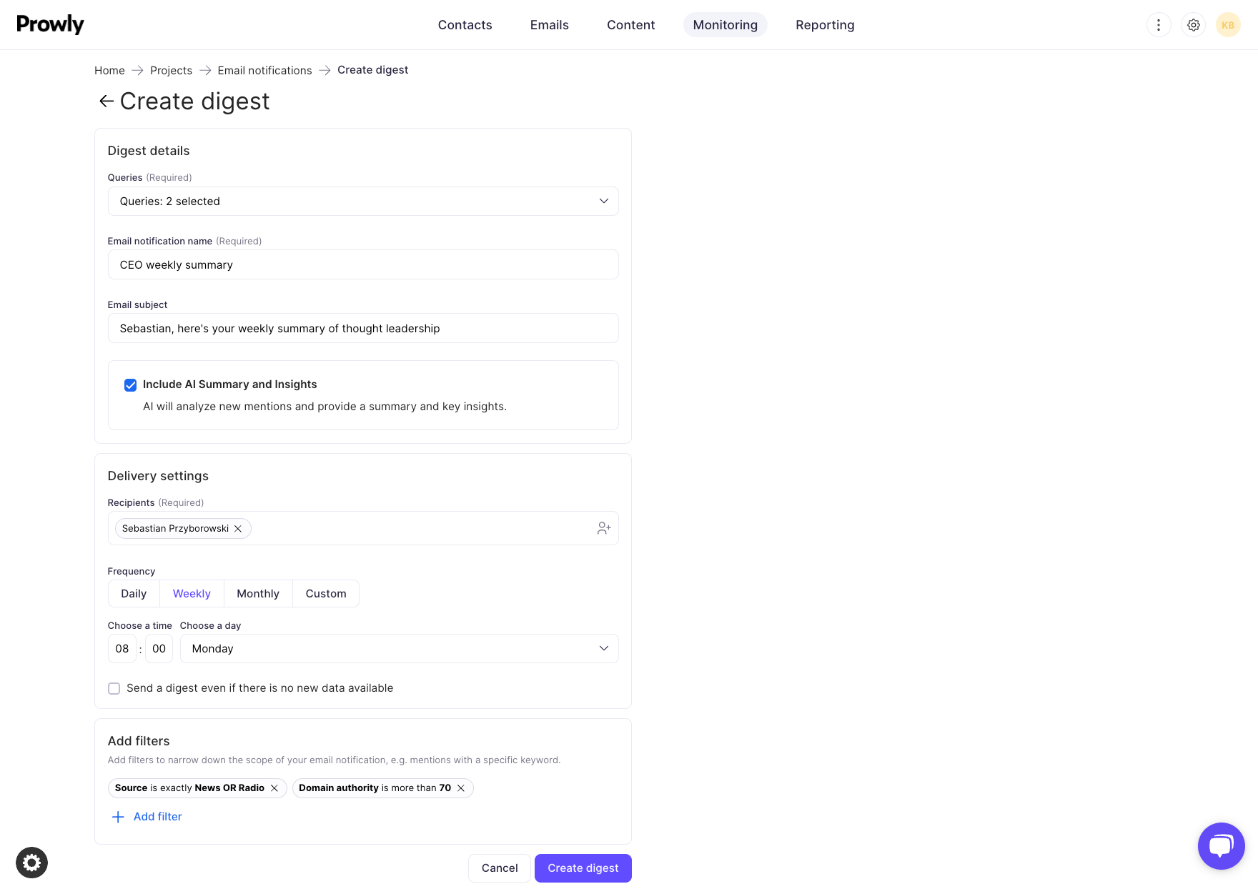 With Prowly monitoring digests, you can set up an industry newsletter in a few minutes: