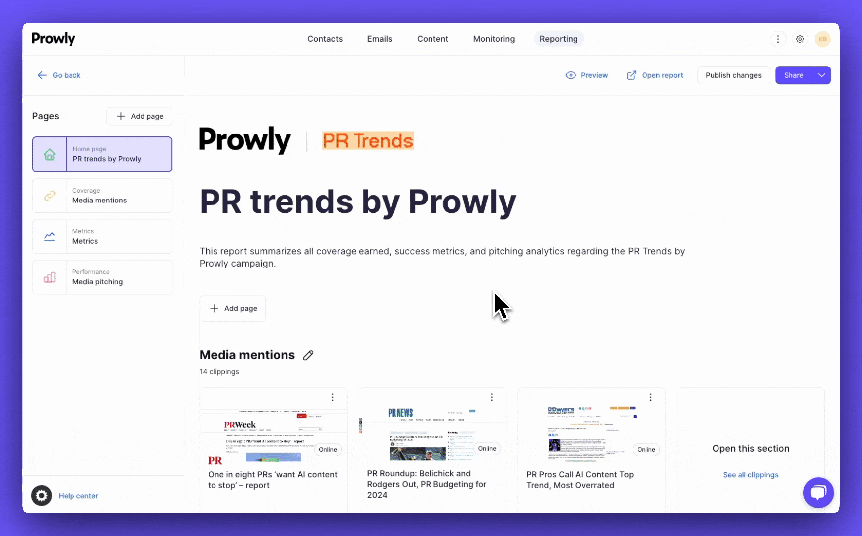 Tools like Prowly help you go beyond basic reporting with media intelligence features built for proving results. From sentiment analysis to share-of-voice benchmarks, you’ll get the data stakeholders actually care about — and a clearer view of how PR drives business outcomes.