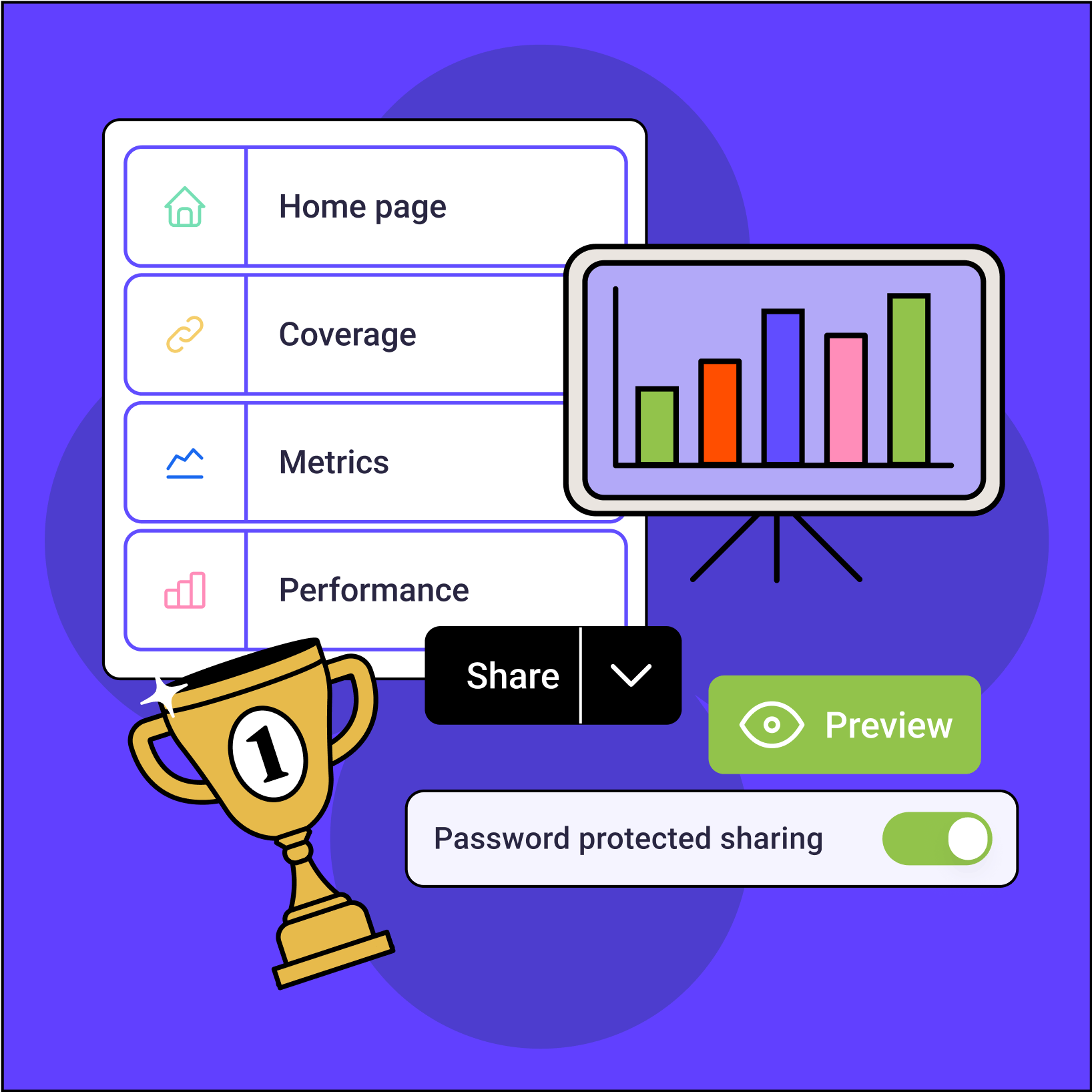 - Easily share a link with password protection or export the report