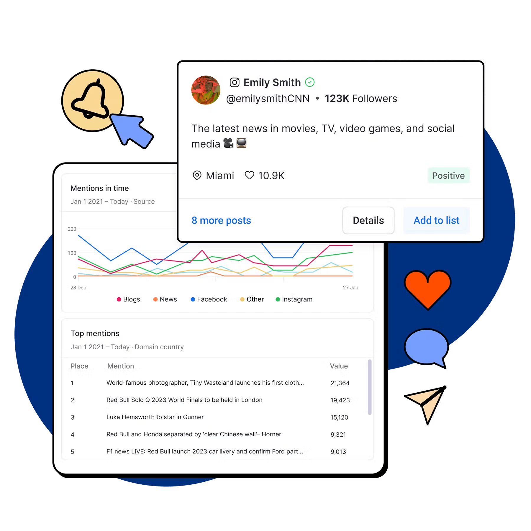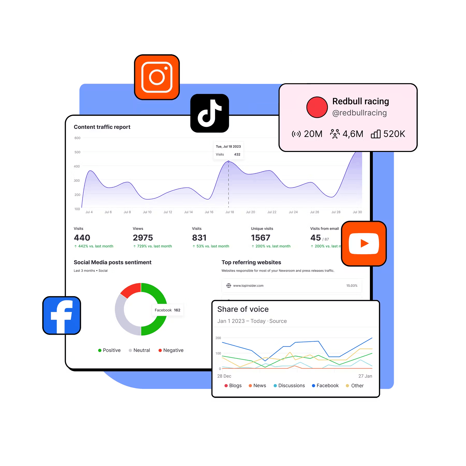 Follow what journalists, influencers, and the audience say about your brand and your competitors. Distill millions of posts on Facebook, TikTok, YouTube, and Instagram into useful insights that will drive your real-time PR.